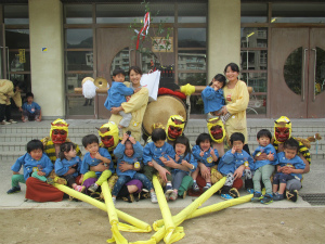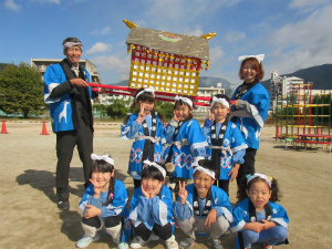 | ワッショイ、ワッショイ、みんなでおみこしをかついだよ! 鬼にだっこしてもらってもっといい子になるよ! |