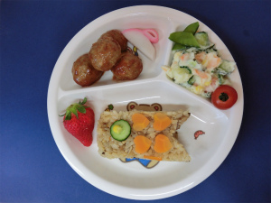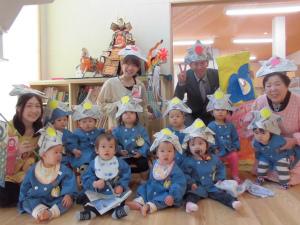 | 「かぶと」をかぶってハイ、チーズ♪ おいしい給食をいただきました。 |