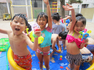 | 暑い日のプールあそびはとっても楽しいね♪ みんなでいっぱいあそんだよ! |