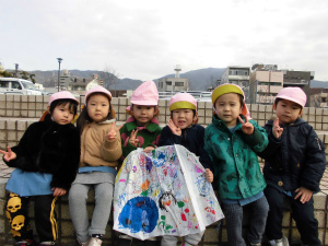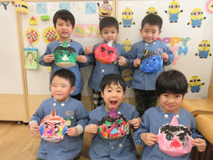 | 自分たちで作った鬼のお面をかぶって泣き虫鬼を やっつけるぞー!! |