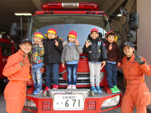 | お別れ遠足で消防署の見学に行ったよ!! 車に乗せてもらってハイ、ポーズ♡ |